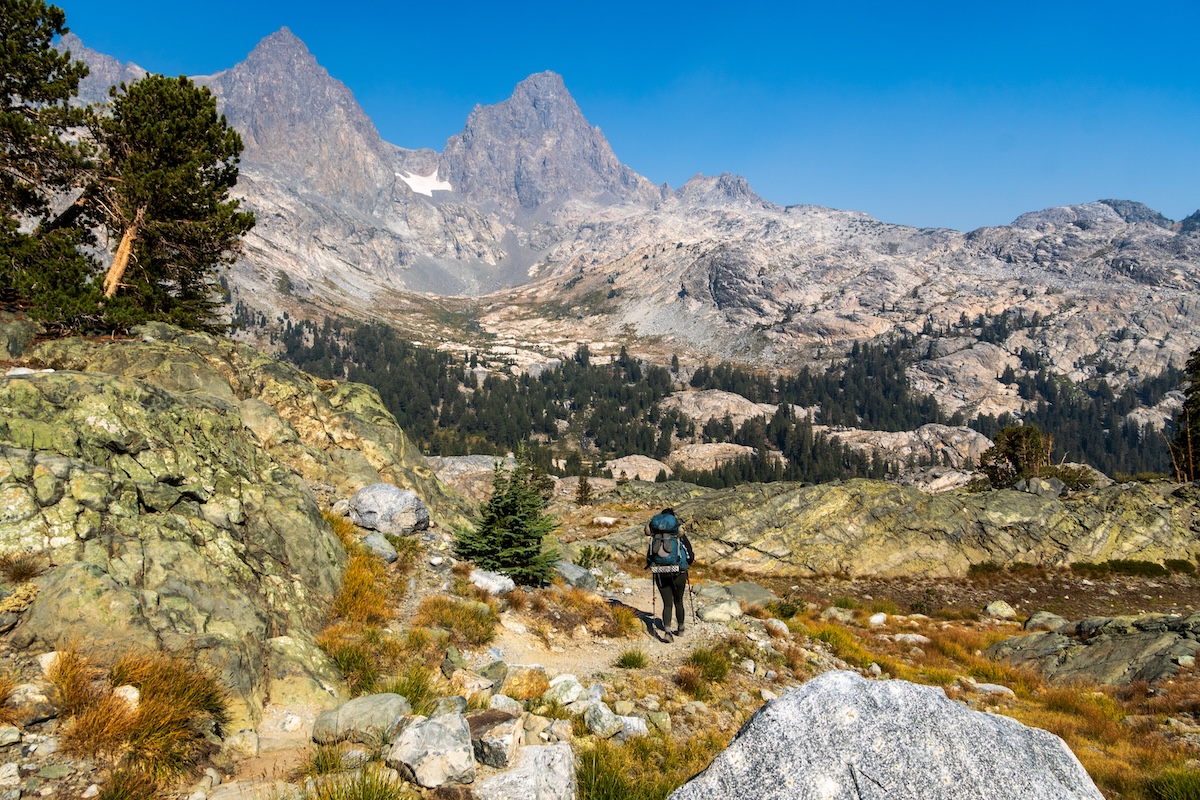 We still had plenty of daylight left so we headed down to the lake shore for a hike. I took a refreshing but chilly dip in the cold alpine water. Thousand Island Lake was notoriously windy and today was no different. We followed a trail along the shore of the lake. The area was peppered with granite boulders and small rugged trees. By now most of the grass had yellowed which was brilliantly illuminated in the late afternoon sun. After a substantial hike we got near the end of the lake and decided to head back.