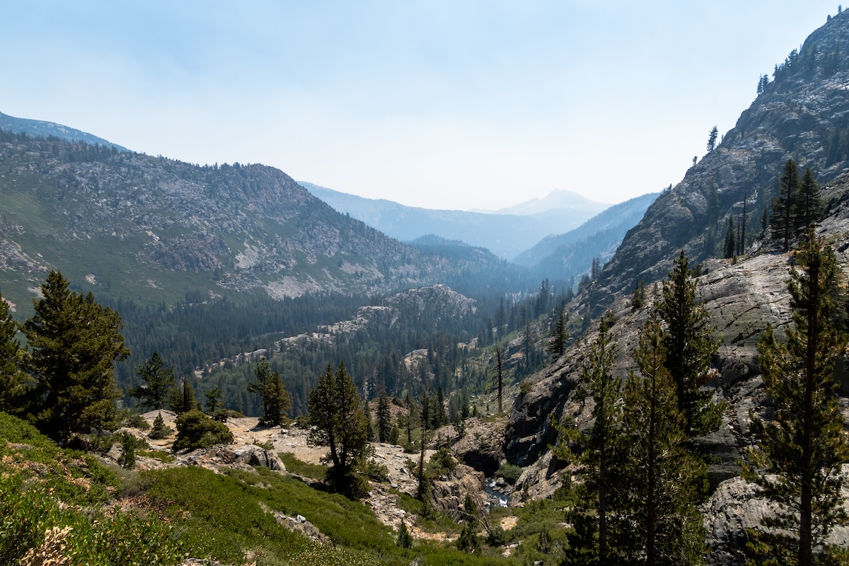 We got an early start at Agnew Meadows where we had spent the night. Despite the heavy wildfire smoke in nearby Mammoth, the sky was clear and the air was cool as we began following the switchbacks upwards. I was excited to see Thousand Island Lake again. It had been a highlight of my Pacific Crest Trail/John Muir Trail adventure I had ten years earlier. This time I would get to share the experience with Sam. We had just finished an awesome three day trip in The Little Lakes Valley and she was excited to explore more of the Sierras with me. This loop trail would take us not only to Thousand Island Lake, but also Garnet, Ediza and Iceberg Lakes, which were supposed to be among some of the most spectacular lakes in the Sierra. This first leg of the trail was on the Pacific Crest Trail. The PCT and the John Muir Trail diverged some miles before Agnew Meadows and reunite at Thousand Island Lake. Once reaching that lake we would follow the JMT South until Shadow Lake then we would follow the Shadow Creek trail back to Agnew Meadows, completing the loop.